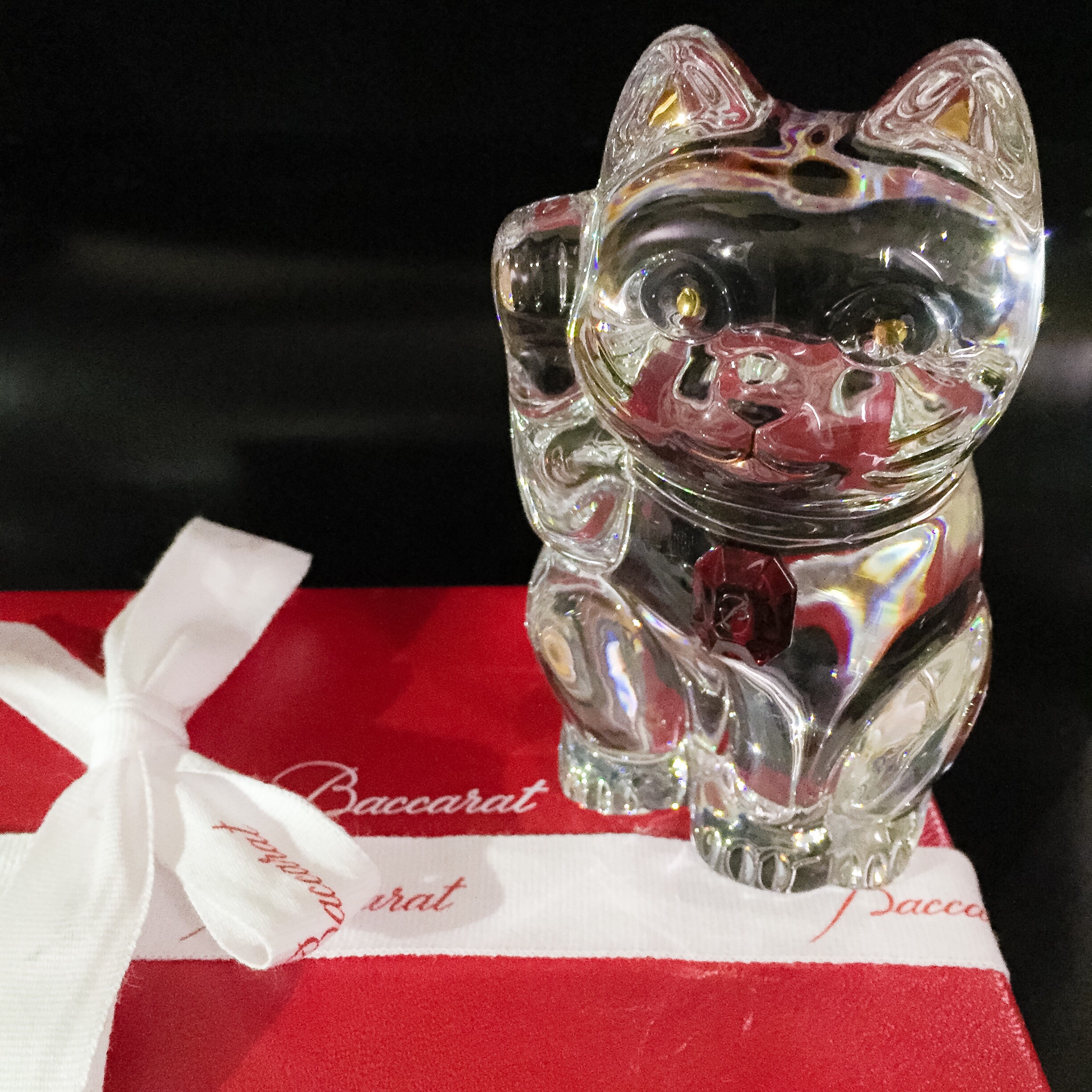 「ぜひ飾ってください」とフランスのクリスタルラグジュアリーブランド、バカラの招き猫です。スタッフ一同、ありがたいお心遣いにただただ感動してしまいました。